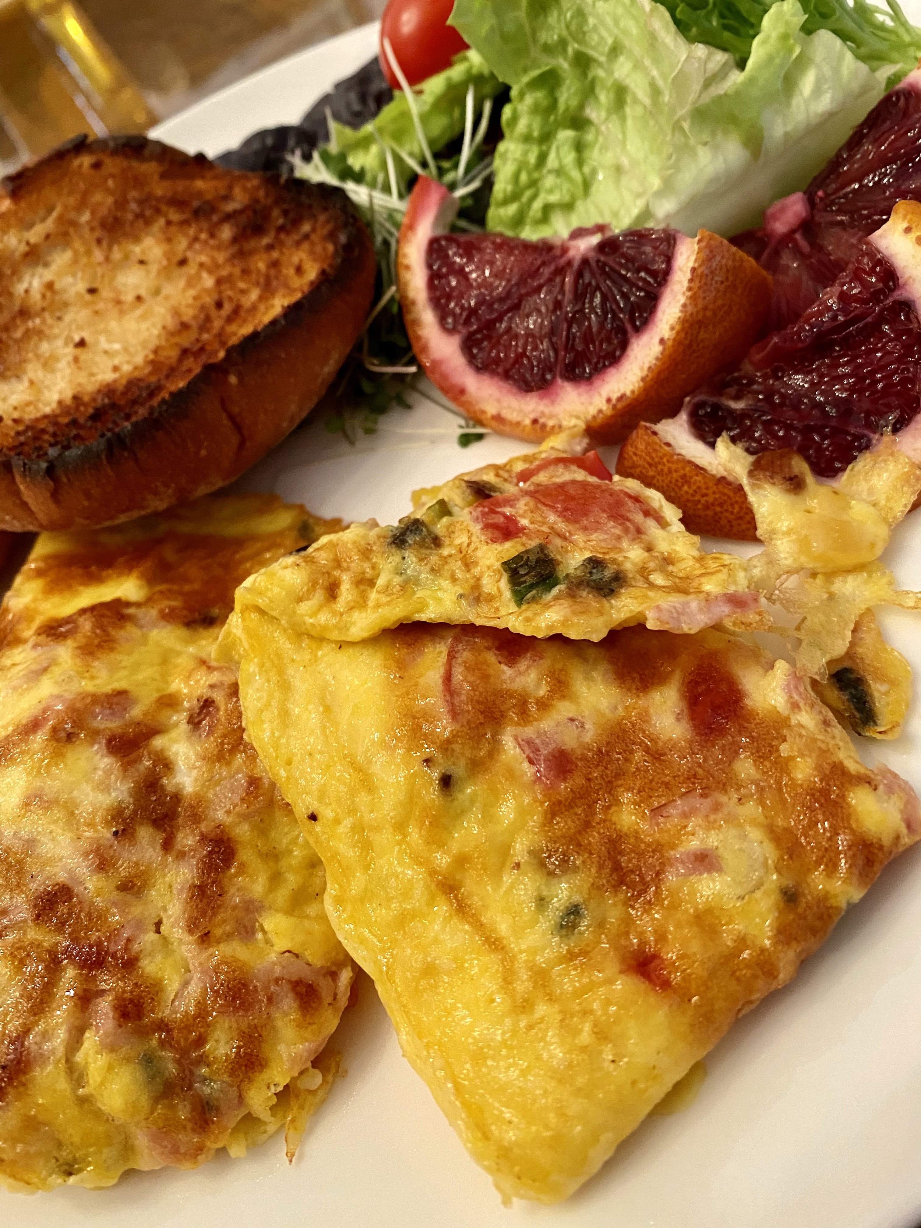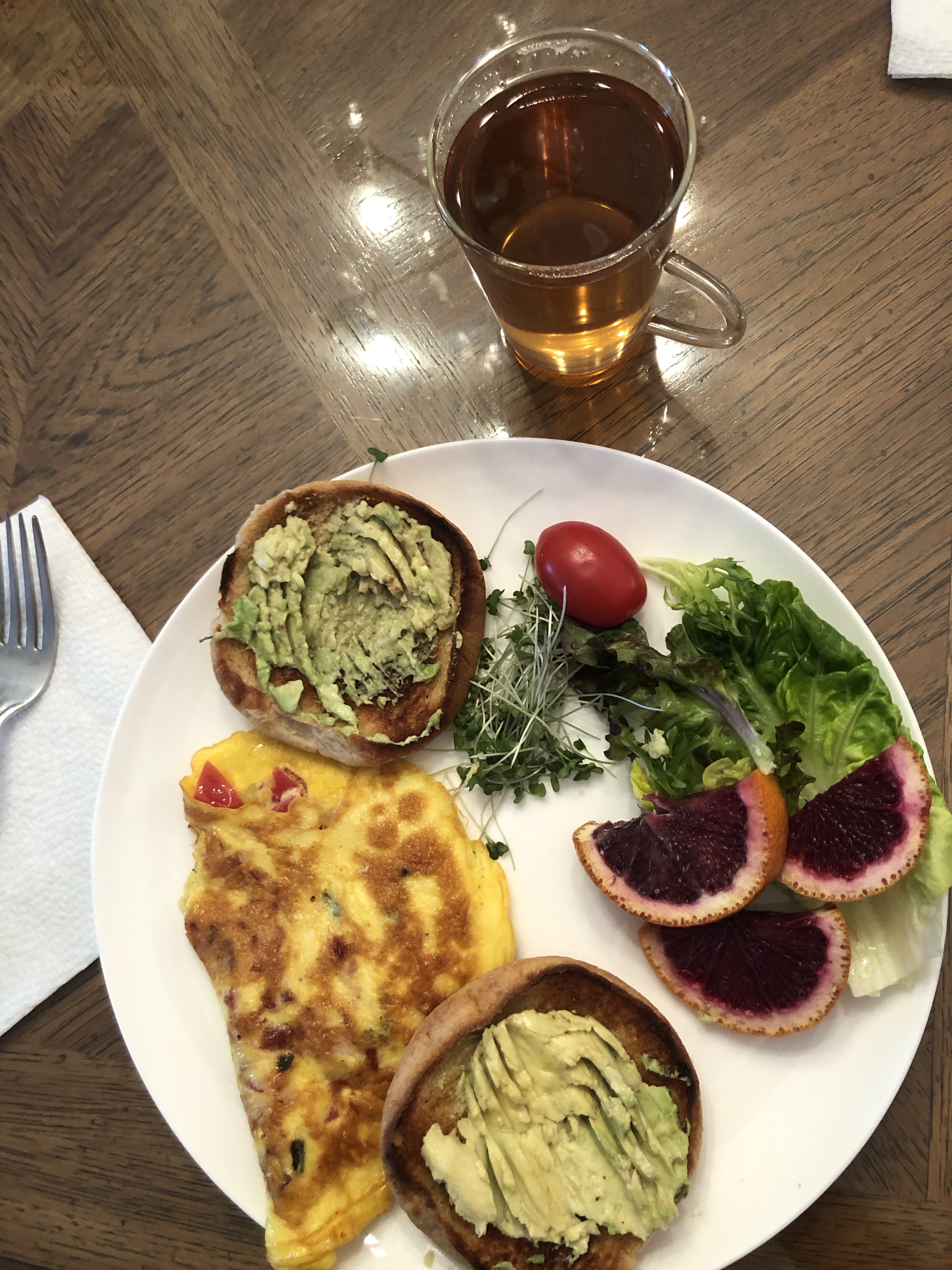 On the run today, omelettes are quick and easy. Add some fruit and raw vegetables; always have something on your plate pulled from the earth. I mashed avocado on my toast for some nice fat energy. On my way to work!