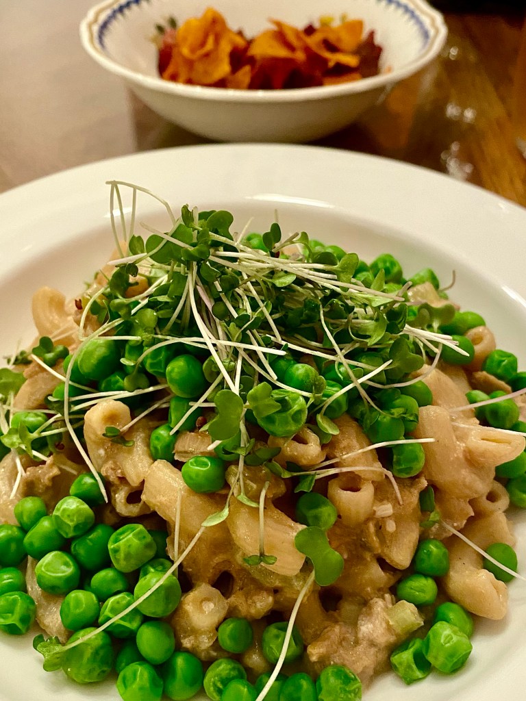 My tastes have changed a bit since then. For my updated tuna casserole I sautéed some chopped onion and celery with a clove of garlic. I made a roux with butter and cornstarch and gradually added in organic vegetable broth. I broke up one of the leftover tuna steaks, about 3 oz., and added to the sauce. I added about 2 TB dark miso paste and some Worcestershire sauce. I had parboiled some rice noodles and mixed them into the sauce. Some fresh ground pepper brightened the savory flavors. I topped with some peas and a handful of micro greens. Pretty tasty, next time I’ll make sure I have some fresh mushrooms on hand. To complete my comfort food meal, I scooped up some Terra chips, Sweets and Beets.