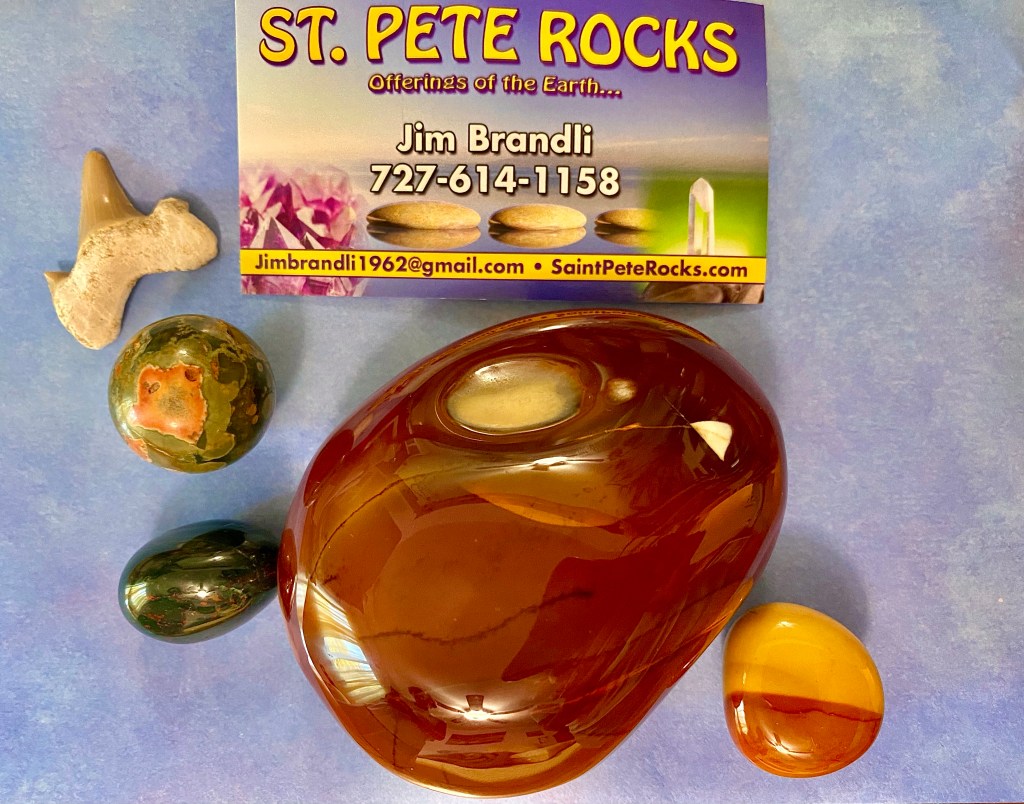 First we stopped at the booth named St. Pete Rocks. I bought Mookalite, a form of jasper from Australia that is meant to impart deep calm when faced with new experiences, points out all possibilities and assists with choosing the best one. Nancy chose Rhyolite, which is purported to ignite the potential and creativity of the soul, potentiates change and assists in fulfilling quests. Also Bloodstone a grounding and protective stone, known for its properties to revitalize the mind and dispel confusion, and a sharks tooth just for fun.