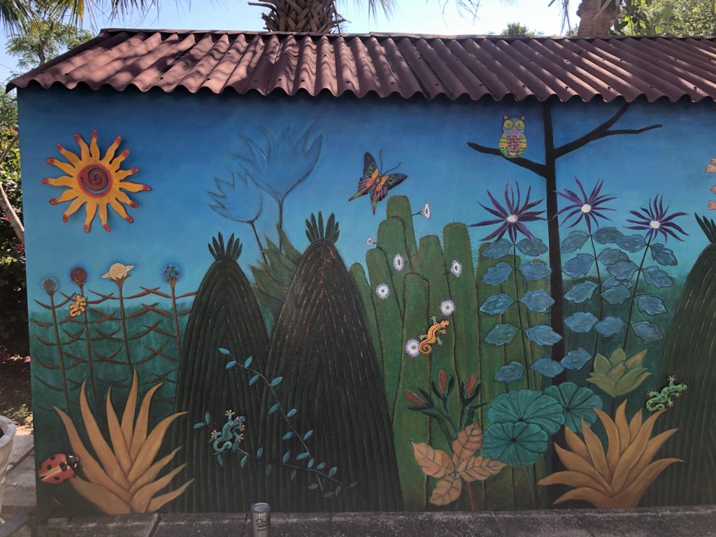 You want to check out the display by Gulfport local artist, Tony Treadway between 11th and 10th Avenues on 60th St. He expresses deep emotions in a sometimes surreal way with vivid colors and thought-provoking images. You can purchase his oils on canvas for very reasonable prices. Here is a whimsical mural painted on a shed.