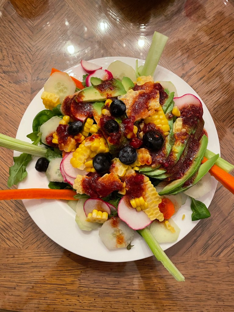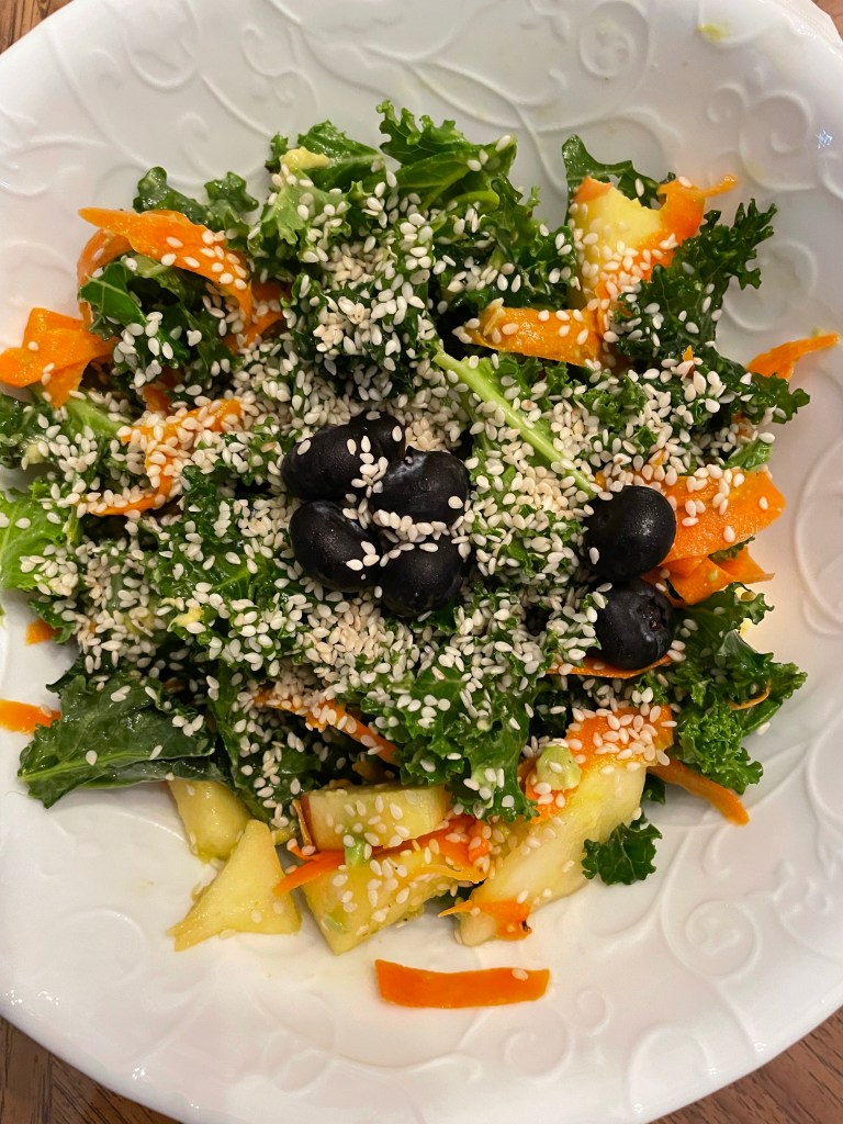 One of the pleasures of this program is you get to eat every two hours and we enjoyed so many colorful fruits and vegetables. You’re meant to eat them all raw, but I made one meal of very lightly sauteed zucchini noodles with raw tomatoes and basil. My favorite salad was kale, apple and carrot in a lemon olive oil dressing with sesame seeds. I blended a small avocado in the dressing for extra fat. Remember, the goal was not to lose weight and I added fat wherever possible. I sometimes added blue cheese dressing, which has the added benefit of being probiotic.