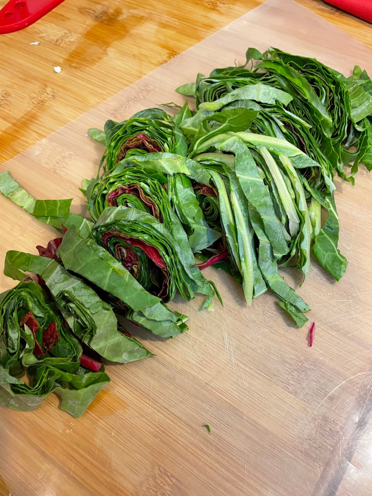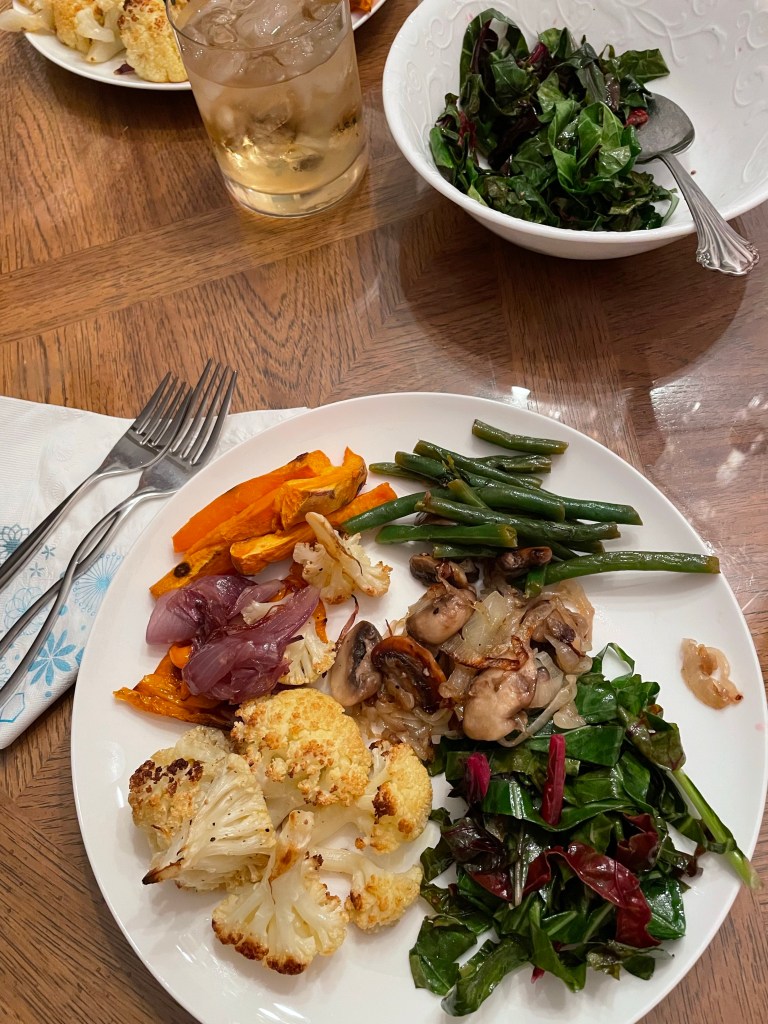 We considered stopping for pizza afterwards, but decided we had lots of fresh vegetables that deserved our attention. It would be criminal to waste such lovely Swiss chard. I put a tray of cauliflower, onions, peppers and sweet potatoes in to roast while Nancy prepared the chard, mushrooms, and green beans with fresh tarragon.