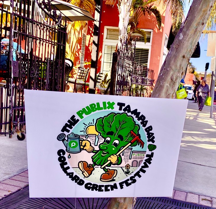 The necessity of cooking collard greens on a Saturday night was precipitated by a visit to the Tampa Bay Collard Green Festival. We saw people walking with large green bags and found our way to the Publix stand with stacks of boxes of super fresh greens. We were surprised to be gifted with two large bunches each and a bag to carry them.