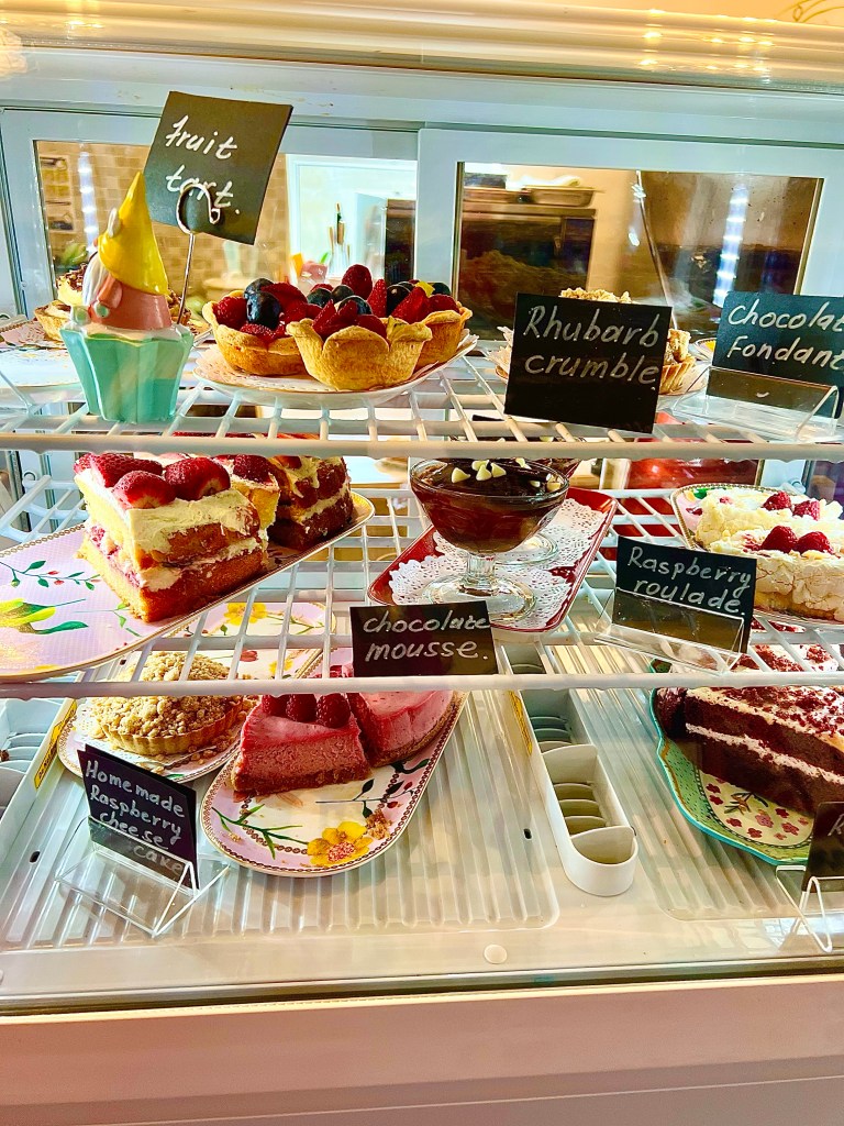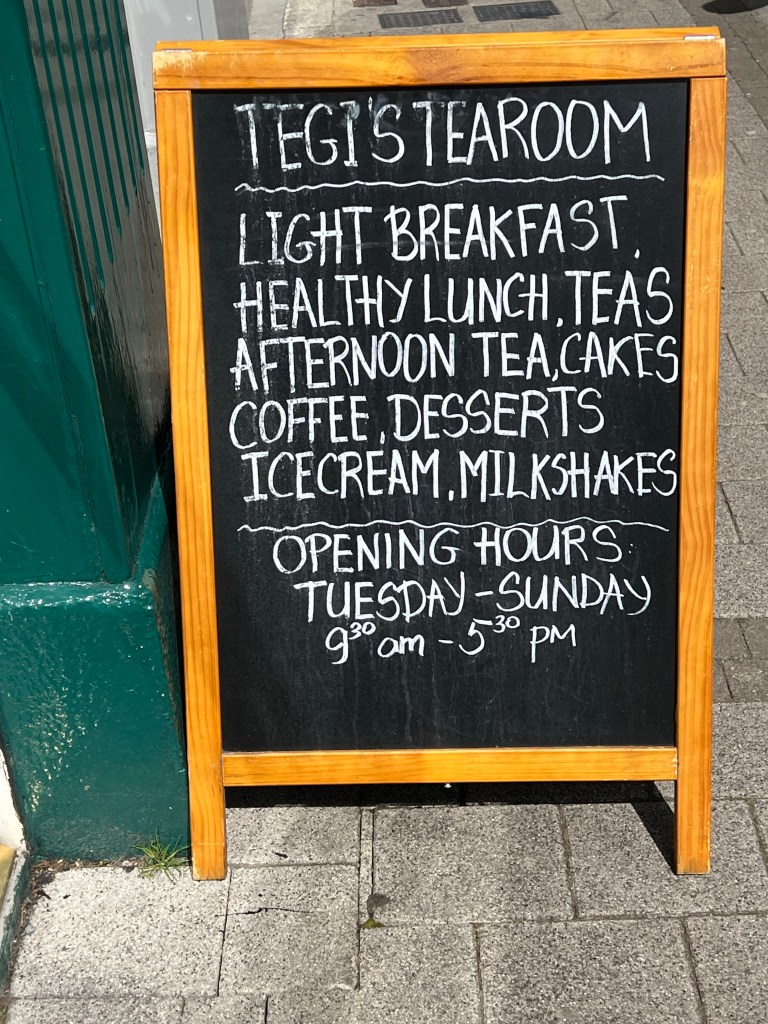 We’ve seen a lot of charming public houses in Ireland, but we always seem to end up in a tea room. After a long morning of wandering in the Irish countryside, we stopped in historic Carrick-on-Shannon for refreshment. We walked up Bridge St. past a pub, which had mouthwatering savory aromas, and crossed the street to get to Tegi’s Tea House. We felt immediately at home with the tufted velvet chairs and floral wallpaper. The display cases were filled with sweet delights as well as fresh salad ingredients and savory croissants. We ordered roasted vegetable soup, a ham and cheese croissant and a salad bowl.