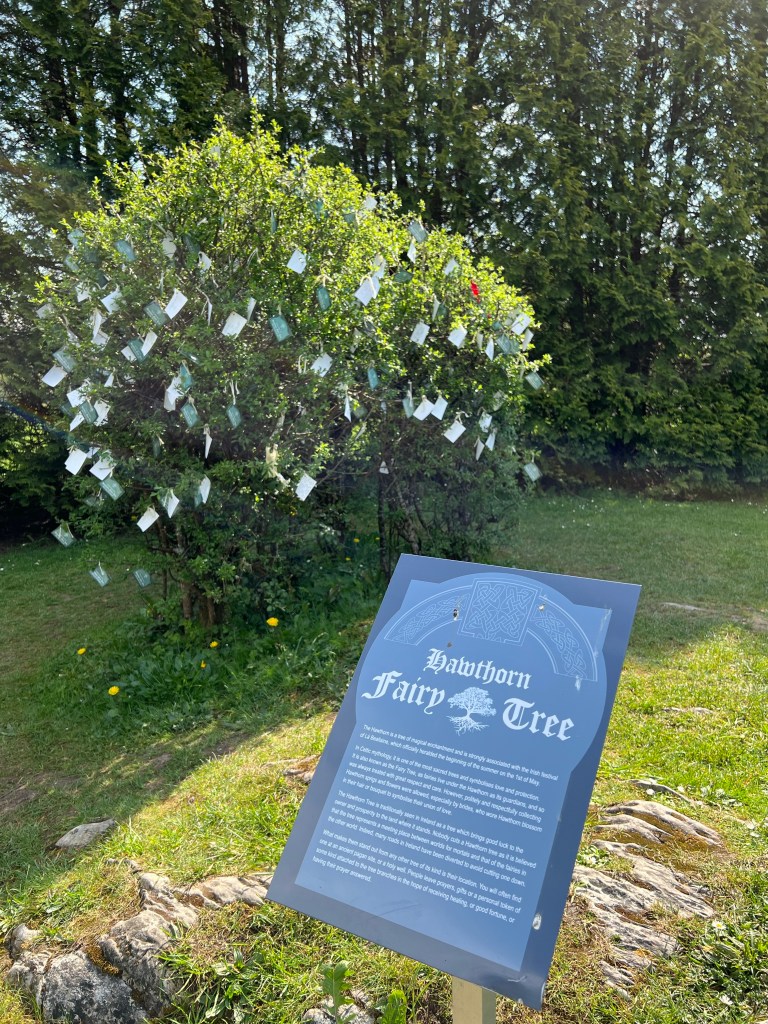 The site houses two Hawthorn “Fairy Trees.” “The Hawthorn is a tree of magical enchantment and is strongly associated with the Irish festival of La Bealtaine, which officially heralds the beginning of summer on May 1. In Celtic mythology it is one of the most sacred trees and symbolizes love and protection.” – See below picture for more information on the symbolic significance of the Hawthorn tree.