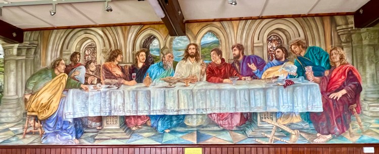 June’s daughter Louise was also kind enough to direct us to the best place on the harbor to eat, John Benny’s Pub on Strand St, which faces the harbor. Louise also recommended that we stop to see the stained glass from a local artist, Harry Clarke at a venerable stone chapel named An Diseart up the street. In addition to the remarkable stained glass work, Mr. Clarke had painted a mural of the Last Supper in one of the classrooms. If you look closely, you can see scenery from the Dingle Peninsula peeking through the windows behind the people, who resemble many of the local residents.